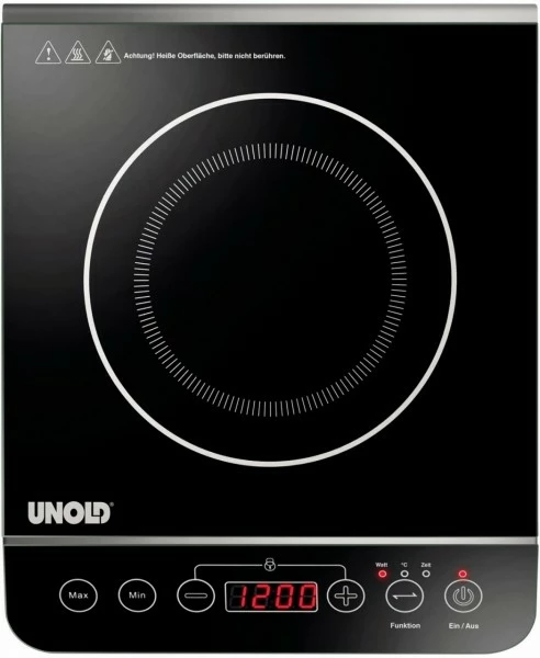 Davon schwärmen die Profis! Jetzt wird der Traum auch für Hobbyköche war: Kochen ohne Abwärme und Nachhitze. Und das Beste: Für die neue Induktionskochplatte von UNOLD® ist auch in der kleinsten Küche Platz. Energiesparendes, komfortables und blitzschnelles Kochen – einfacher geht’s nicht. Über ein elegantes Touchpad-Bedienfeld, das zur besseren Lesbarkeit abgeflacht ist, werden Temperatur und Timer eingestellt. Das bis zu 2.000 Watt starke Kochfeld ist in sechs Leistungsstufen regelbar. Der Timer ist bis auf 180 Minuten einstellbar; darüber hinaus gibt es 10 Temperaturstufen, von 60° C bis 240° C. Die 3-fach Sicherheitsfunktion passt das Gerät an Änderungen der Stromspannung an, schaltet die Platten nach spätestens zwei Stunden von alleine ab und erkennt selbständig für Induktion ungeeignete Töpfe. Überhitzungsschutz und Kindersicherung sind serienmäßig vorhanden.