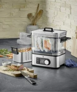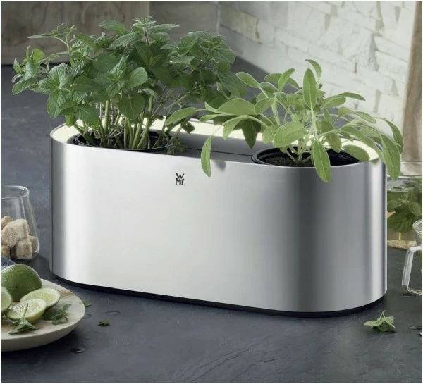 Rücken Sie Kräuter und Zimmerpflanzen ins rechte Licht: Der WMF Indoor-Kräutergarten hat Platz für zwei Pflanzen und glänzt nicht nur mit seiner edlen Cromargan®-Oberfläche, sondern auch mit einer edlen LED-Beleuchtung. Der Clou: Einfach das Edelstahlgehäuse berühren und dank Easy Touch Technologie ein einzigartiges Licht-Ambiente in drei Helligkeitsstufen zaubern. Das intelligente Bewässerungssystem hält Kräuter lange frisch – so kann man das Gießen ruhig für ein paar Tage vergessen.