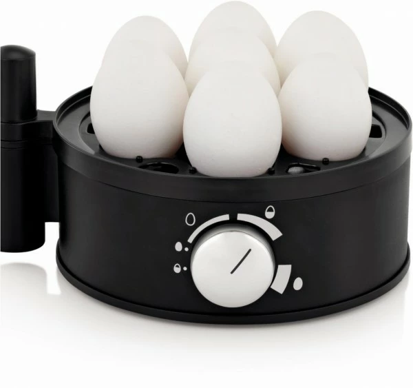 Cromargan® matt, Für 1 – 7 Eier, Kochzeitelektronik, Fortkochstufe, Weich-, Mittel- und Hartkocheinstellung, Automatischer Signalton bei Kochende, Beleuchteter Ein/Aus-Schalter, Edelstahlheizschale, Überhitzungsschutz, Messbecher mit Eipick, 380 Watt Leistung.